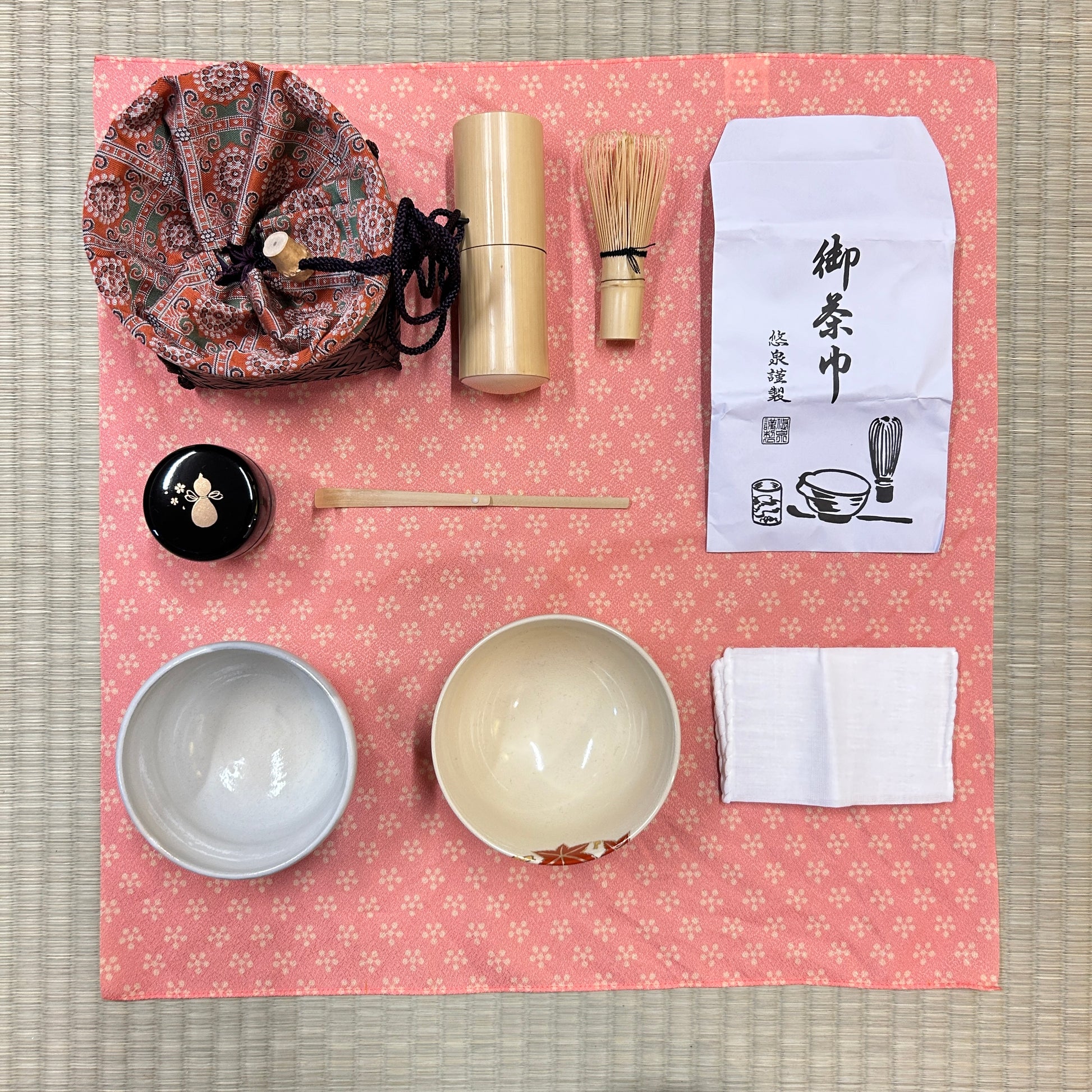 茶道に必要な基本の道具がひとつの籠に収まった、携帯性に優れたコンパクトな茶道具セットです。