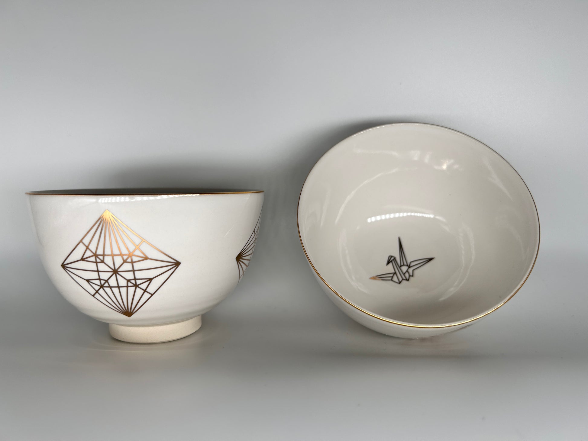 折鶴古来、折り鶴は四角い紙を折って作る平和や幸福への願いを込めたものです。茶碗の外側には折り鶴の展開図が、内側には完成した折り鶴の姿が描かれています。今の時代、折り鶴で平和と幸せを祈らずにはいられません。